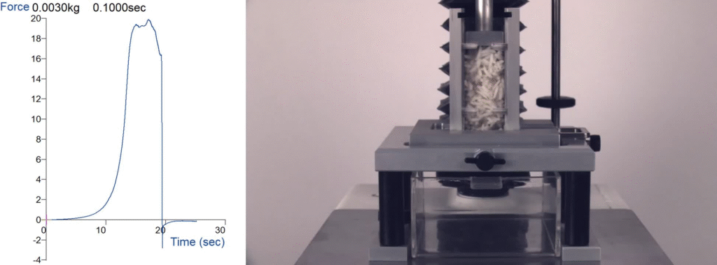 • Test fikri: Sıkıştırma testi oldukça etkili olabilir. Yapışkanlık ve yapışkanlık için, bir silindir prob, probu bir pirinç yığınından uzaklaştırmak için gereken kuvveti ölçebilir. Sertlik için, küçük silindirik bir sonda şekillendirilmiş bir pirinç topunu sıkıştırabilir. Kuvvet-zaman/mesafe grafiği, başlangıçtaki direnci ve sonraki yapışkanlığı gösterecektir. Ekstrüzyon kuvvetini ölçmek için Pirinç Ekstrüzyon Teçhizatı kullanılarak kombine bir sıkıştırma ve ekstrüzyon testi sağlanabilir. Bu cihaz, ISO 11747'ye göre pişirme sonrasında pirinç tanesinin ekstrüzyona karşı direncinin belirlenmesini sağlar.